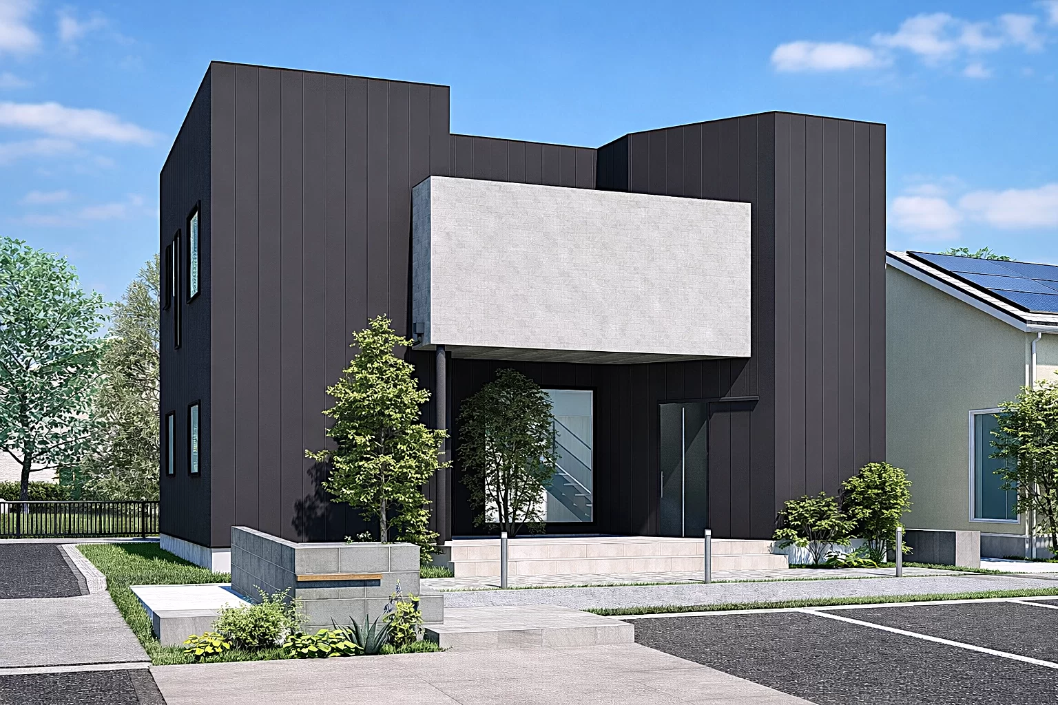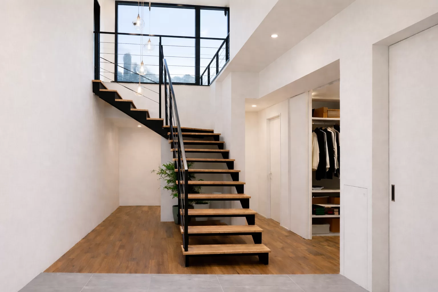 エントランスから覗く鉄骨階段が、帰宅のひとときを特別な時間に演出。吹き抜けからやわらかな光が差し込み、2階のリビングへと心地よくつながります。