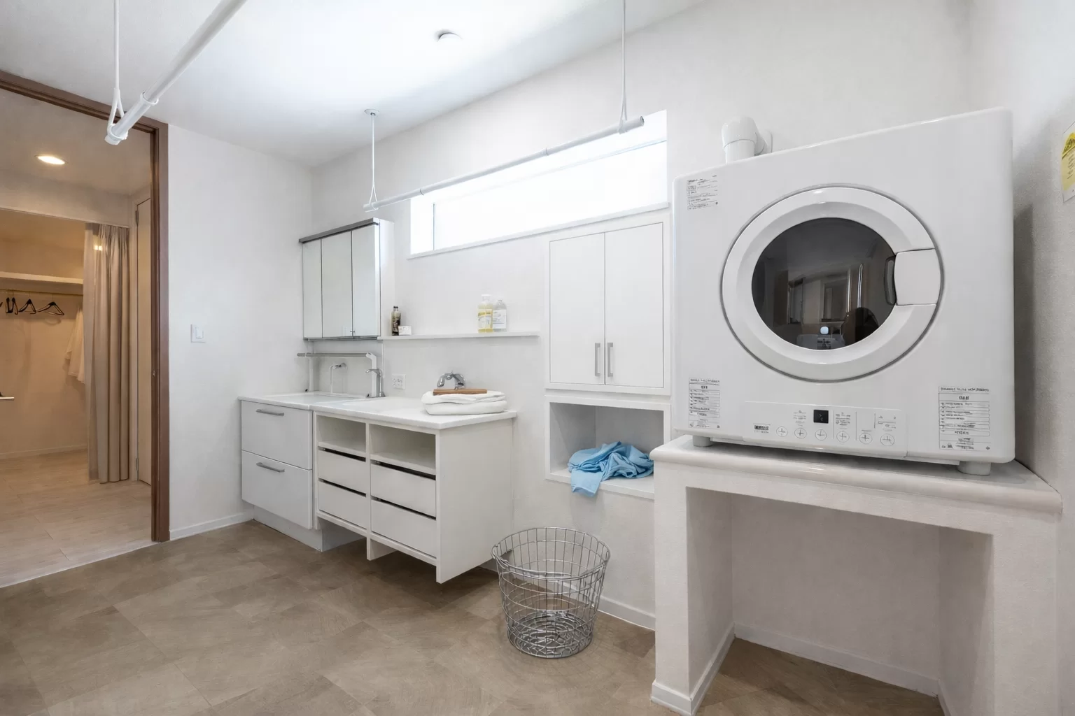 2階から1階へ洗濯物をスムーズに運べるランドリーシューター付きのユーティリティ。移動の負担を減らし、洗濯から片付けまでの流れをスムーズに整え、毎日の家事を快適にします。