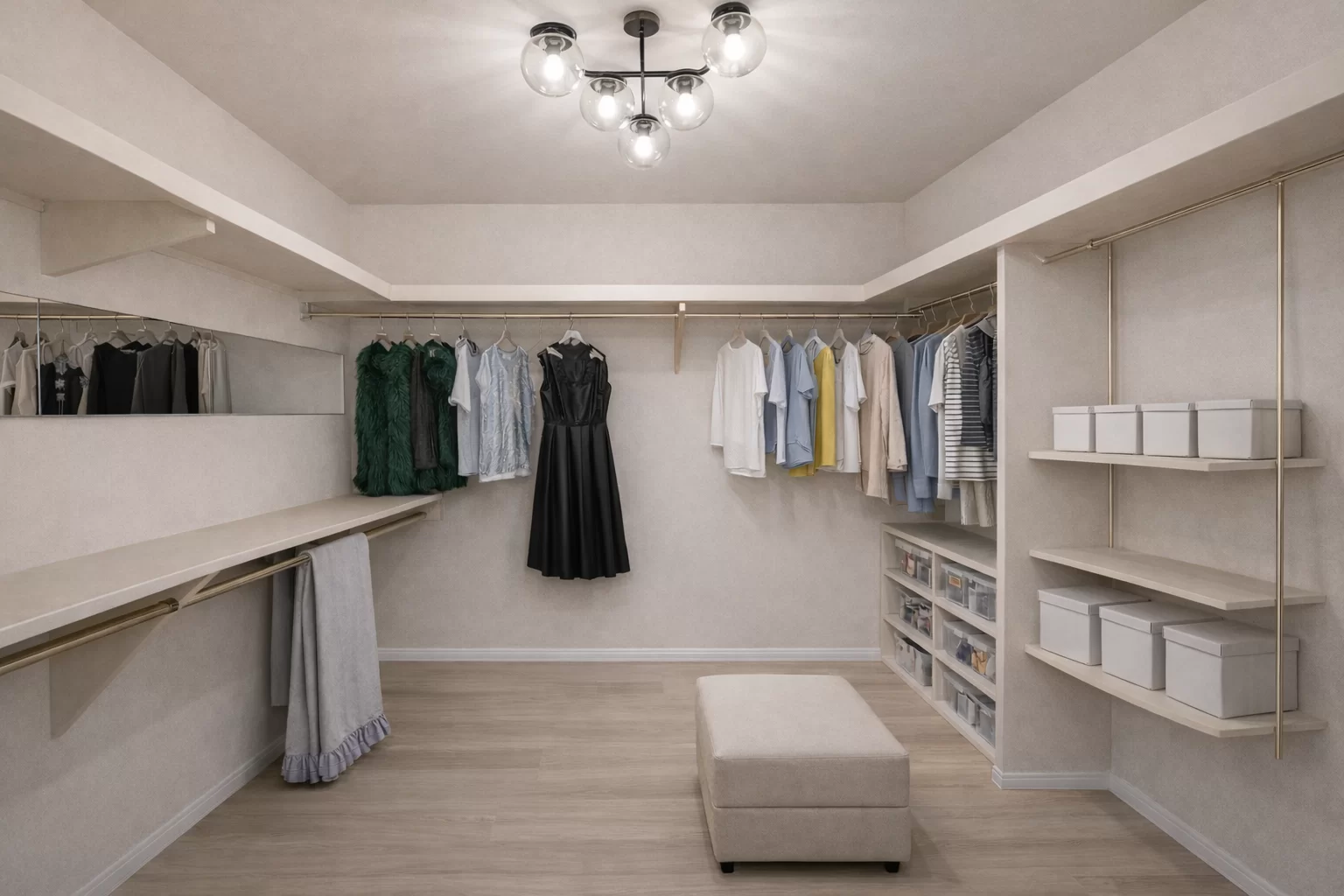広々とした6帖のファミリークローゼット。アクセサリーや小物が映える、魅せる収納を楽しめます。衣類の出し入れもスムーズに行え、毎日の身支度が自然と整います。