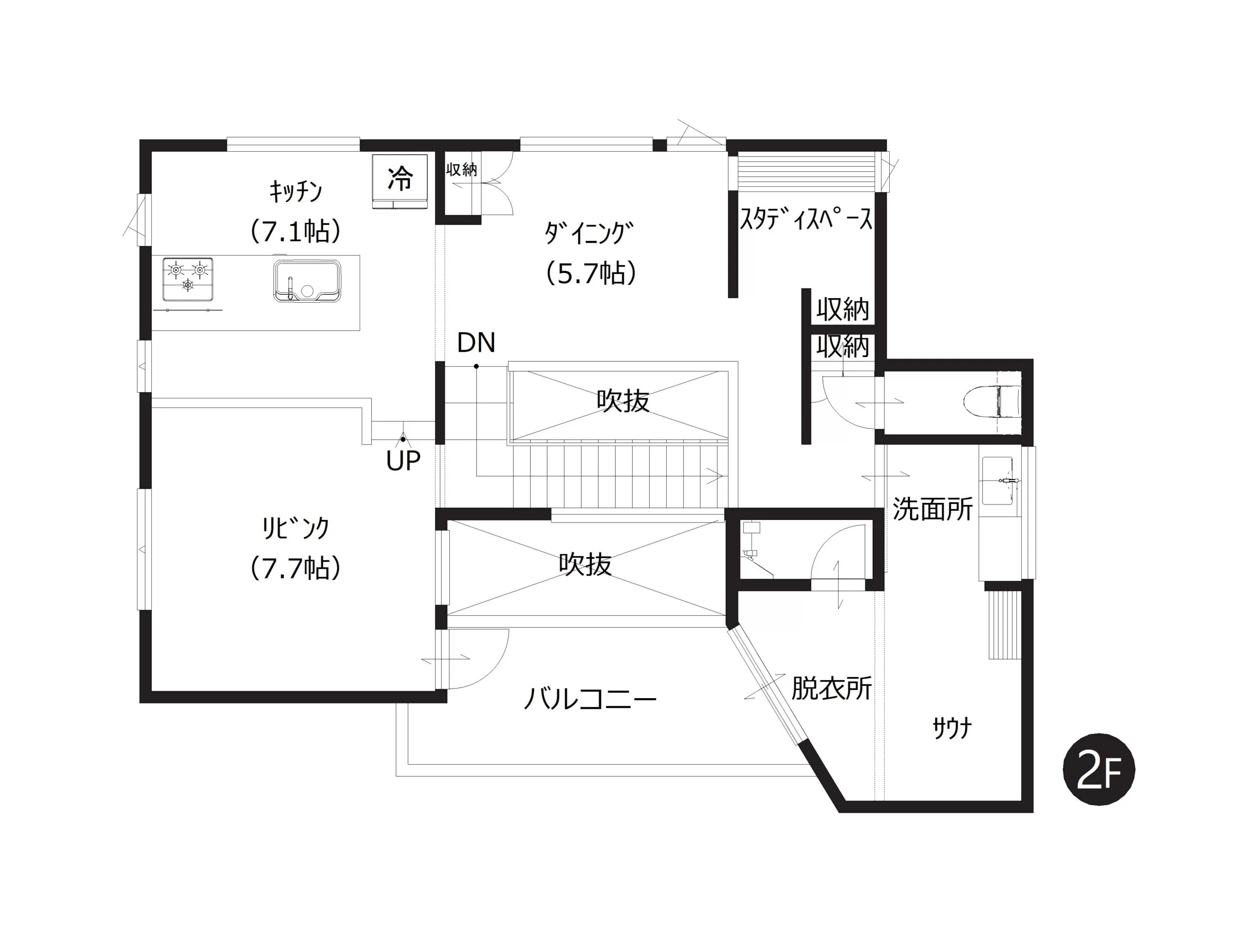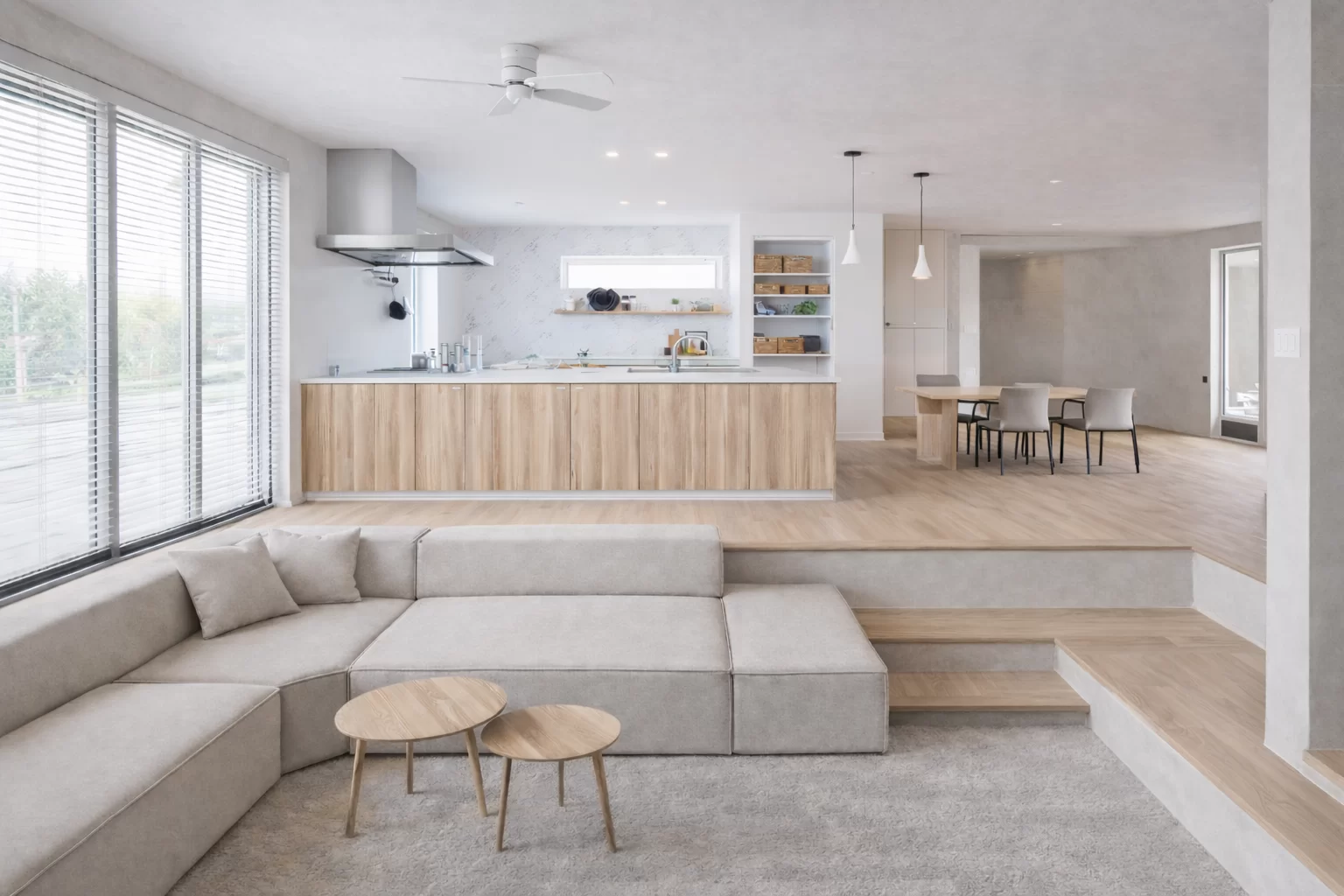 LDKに高低差を設けることで、デザイン性のある空間に。つながりと開放感を感じながら、ほどよくゾーニングされた広がりが生まれます。段差はベンチとしても活用でき、くつろぎの一角として楽しめます。