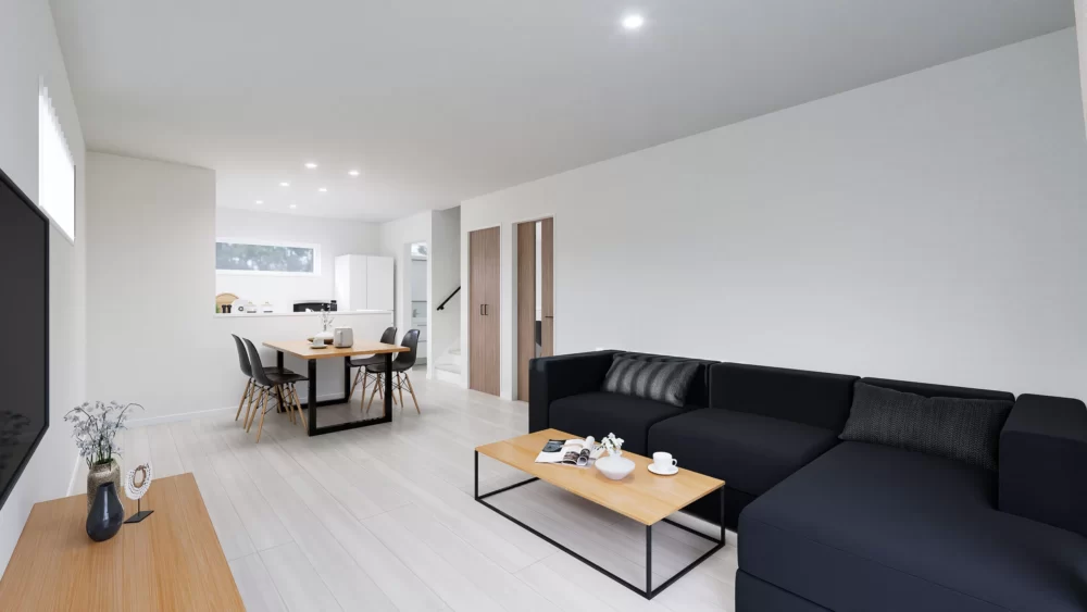 18帖の広々LDKは、ソファを置いてもゆとりのある開放的な空間。シンプルモダンなデザインで、家族のくつろぎ時間を心地よく演出します。