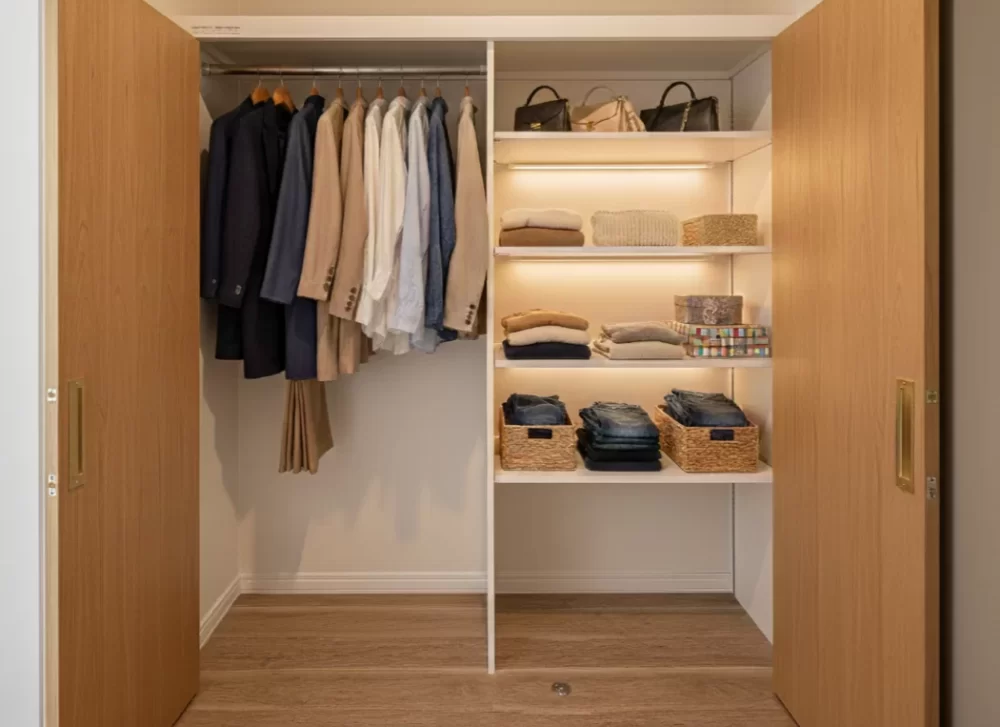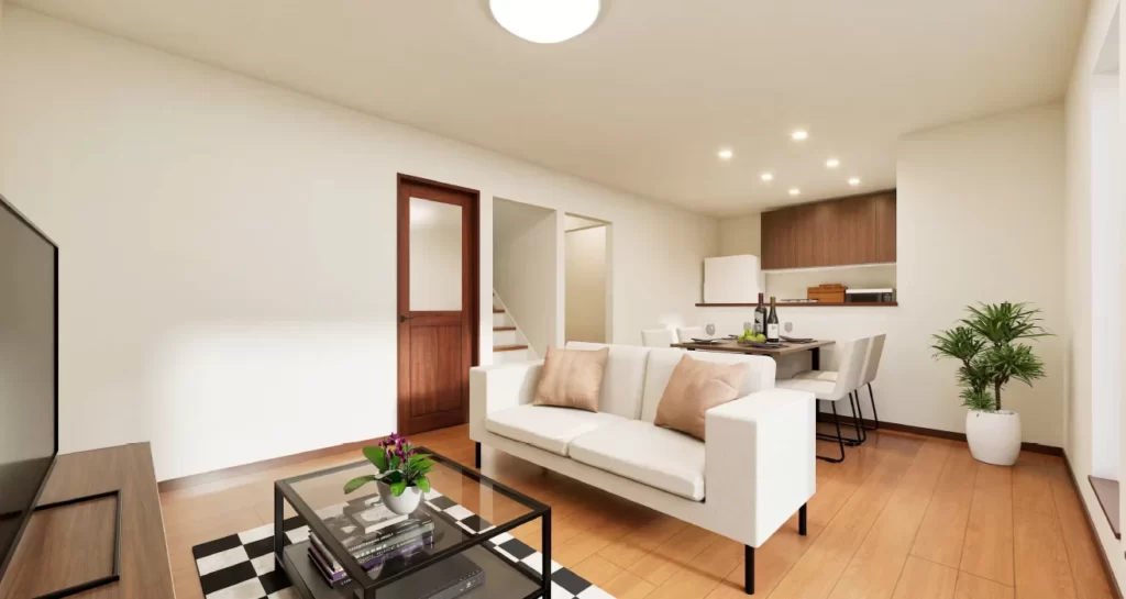 木目調の温かみあるLDKは、家族が自然と集まる心地よい空間。キッチンには収納たっぷりのパントリーを備え、毎日の家事もスムーズに行えます。