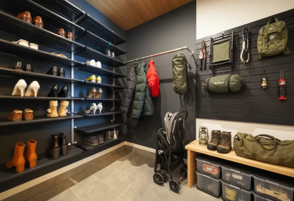玄関には広々とした土間収納を設置。靴はもちろん、趣味のアウトドアグッズやお庭の手入れ用品までまとめて収納可能。欲しいものがすぐ手に取れる広々設計です。