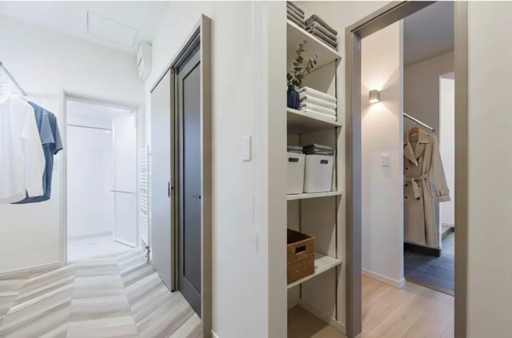 ユーティリティからウォークインクローゼット、寝室へとつながる回遊動線で、洗濯・収納・着替えまでスムーズに完結。帰宅後はリビングを通らず水回りへ直行でき、毎日の家事がラクで快適な間取りです。