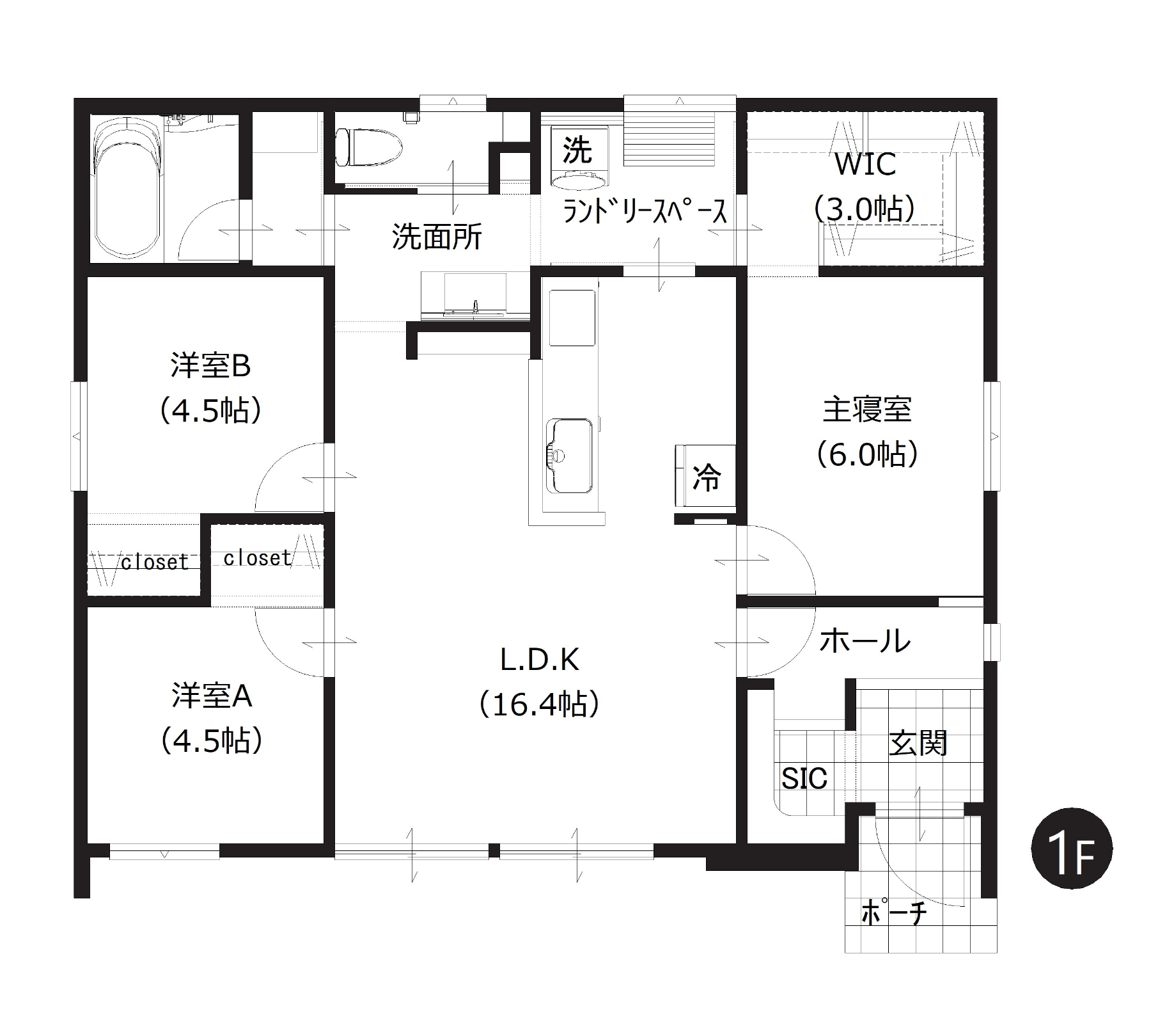3帖のウォークインクローゼットは棚とハンガーパイプ付きで収納力抜群。寝室とランドリーの両方からアクセスでき、着替えや洗濯物の出し入れがスムーズ。家事と暮らしが快適につながる設計です。