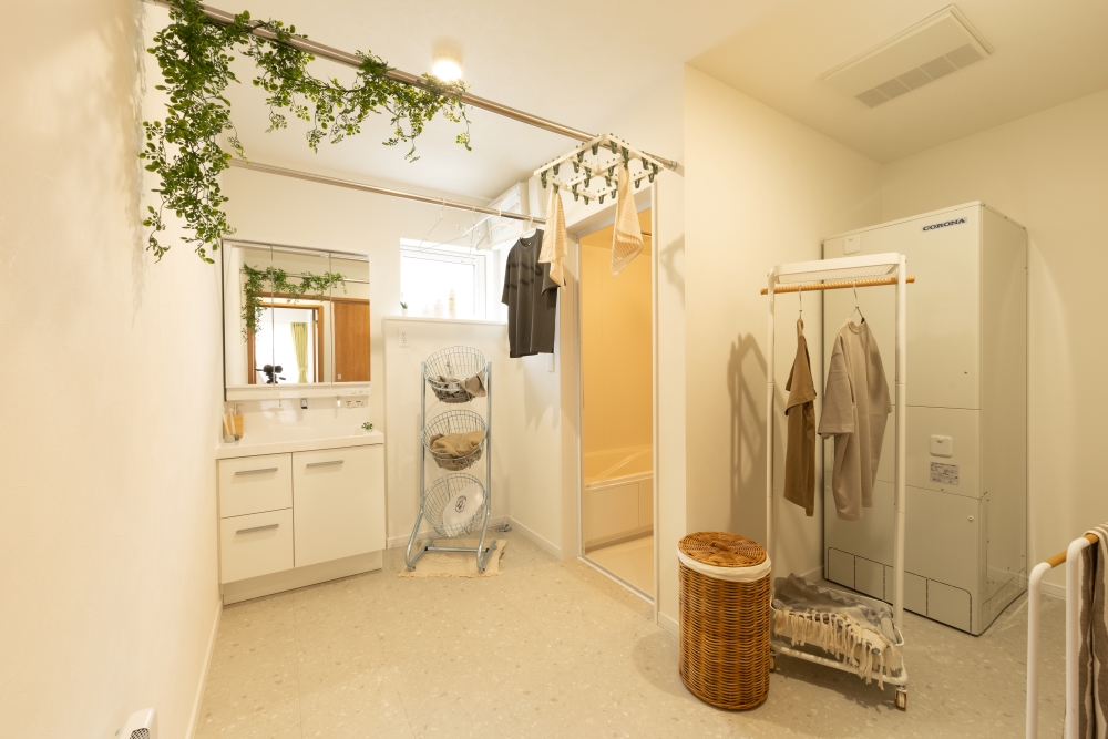 広々としたユーティリティには、収納棚を置けば日用品や洗剤もすっきり整理でき、アイロン掛けなどの作業もスムーズに。毎日の家事を快適にこなせるゆとりあるスペースです。