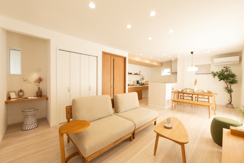 ナチュラルテイストの心地よいリビング。インテリアカウンターには小物を飾ったり、読書を楽しめます。開け幅自由でデザイン性の高い親子ドアを採用し、大きな荷物もスムーズに運べます。