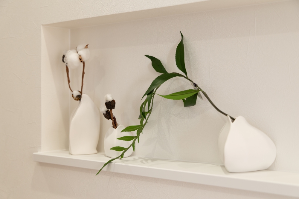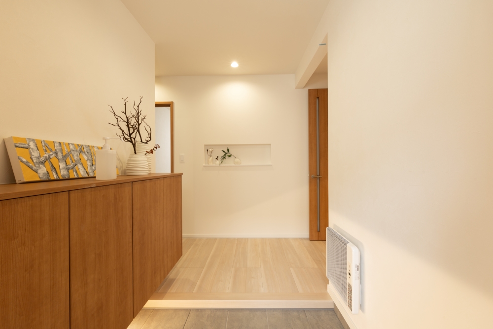 ホールとリビングには、壁面にくぼみを施したおしゃれなニッチを取り入れました。小物や花を飾れば彩りを添えられ、細部までこだわったデザインが魅力の住まいです。