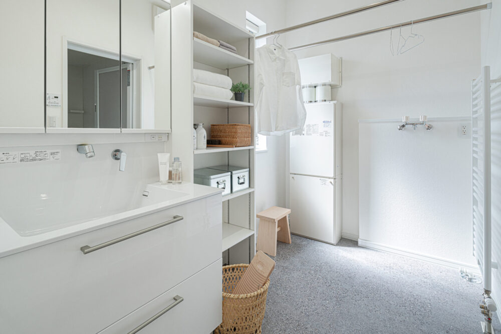 ゆったりサイズのユーティリティには幅120㎝のワイド洗面台を設置。収納を置けば、タオルや小物もすっきり片付けられ、毎日の家事をより快適にします。