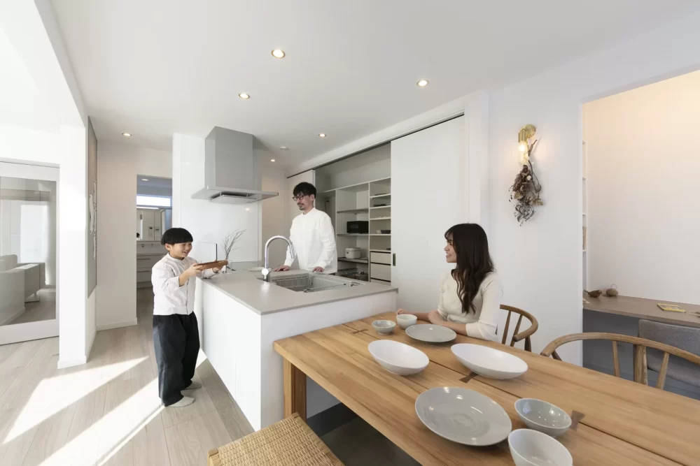 キッチンとダイニングを横並びに配置することで、配膳や片付けがしやすく、毎日の家事がスムーズに。リビングを見渡せて、家族との会話も楽しめます♪