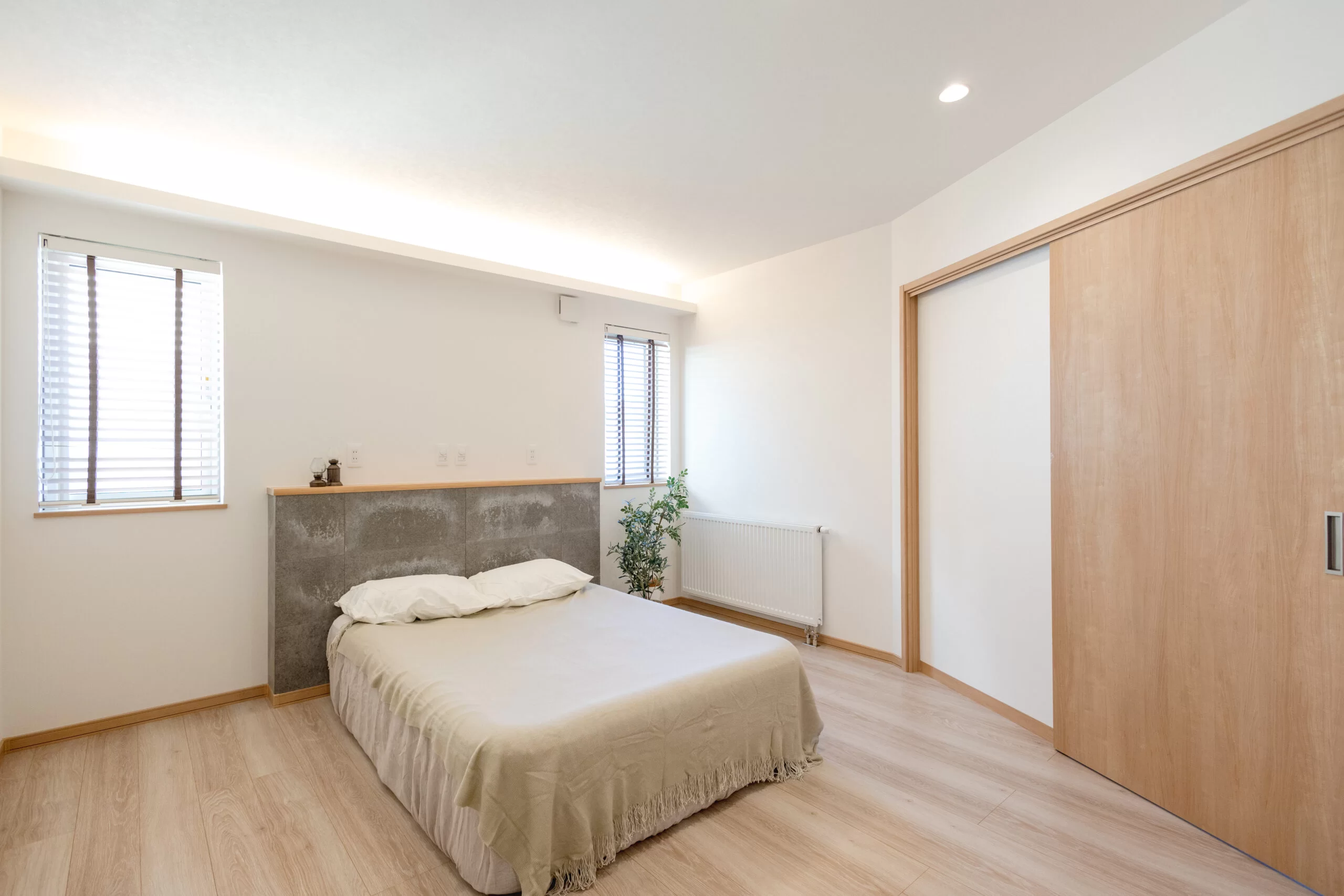 主寝室には間接照明を設置。やわらかな光が空間を包み込み、デザイン性と心地よさを両立したくつろぎの空間に仕上げました。
