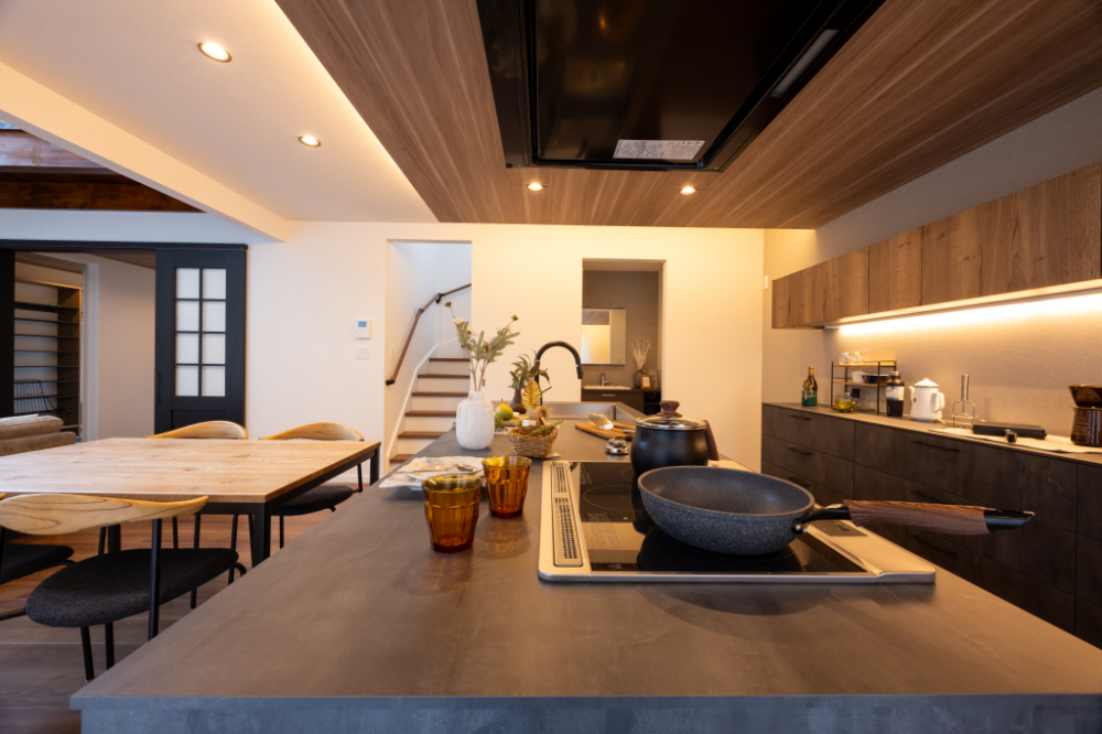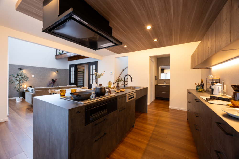 どこからでも回遊できるアイランドキッチンは、配膳や片付けがスムーズで家事の時短に。子どもや友人など複数人での料理もしやすく、幅270cmの背面収納とパントリー付きで使い勝手も抜群です。