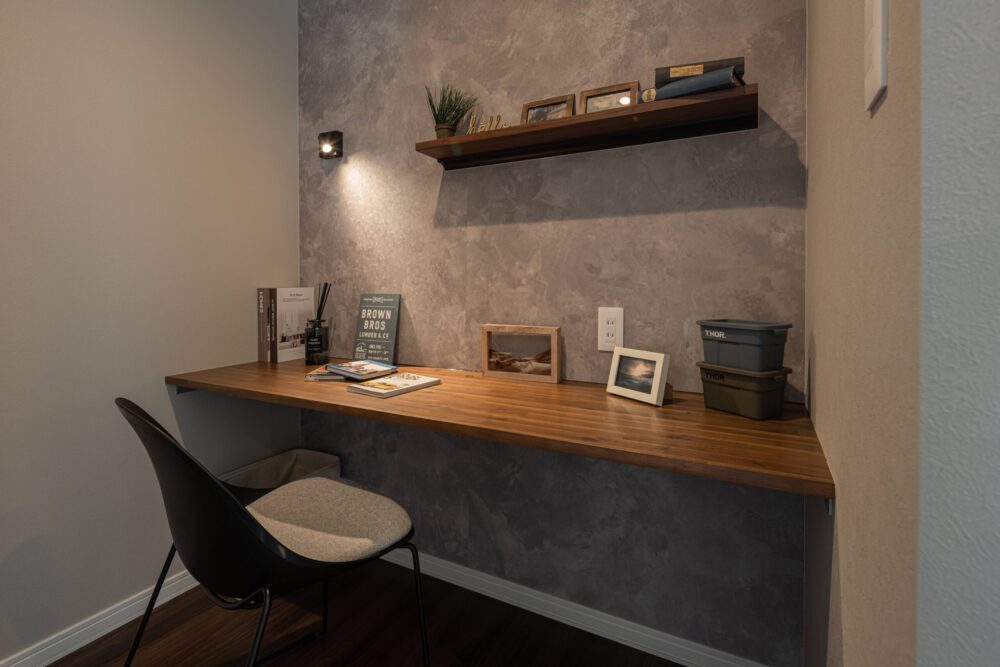 コンパクトながら落ち着いた書斎スペース。収納棚も備え、在宅ワークや趣味を時間を楽しむこともできるおこもり空間で、様々な用途で活躍します。