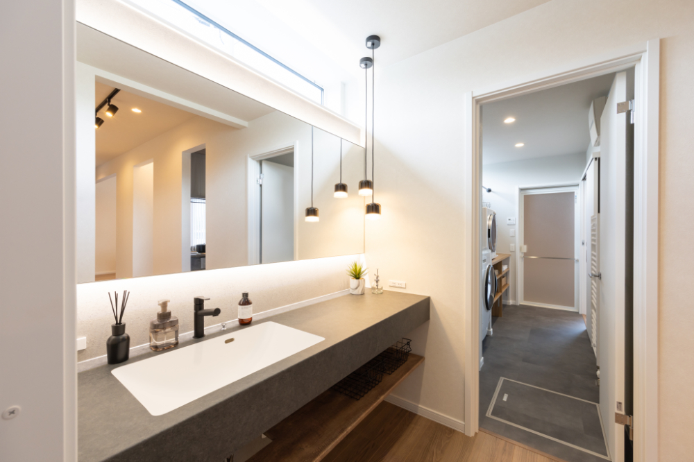 洗面台にカウンターを設置し、毎日の身支度が楽しくなるパウダールーム仕様。脱衣室と分けているので、家族の入浴中や来客時も気軽に使えます。