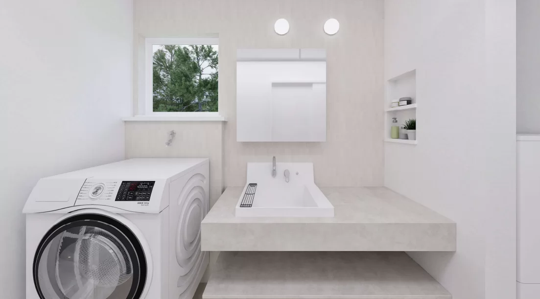 洗面台は造作風のカウンター付きタイプを採用。スタイリッシュで使いやすいデザインに加え、下部はオープン棚仕様でタオルなどもすっきり整理できます。見た目にも美しく、快適な空間に仕上げました。