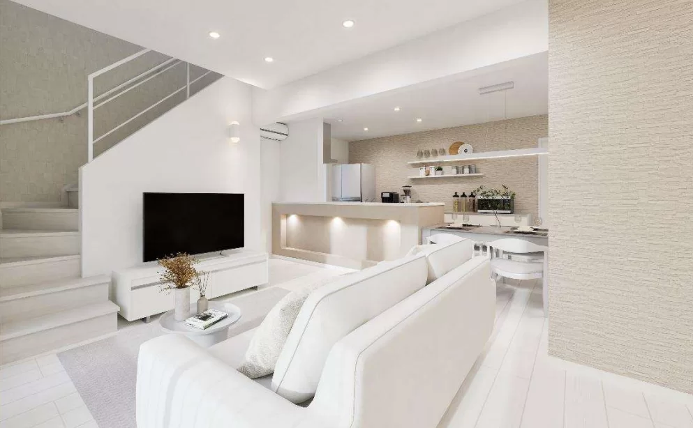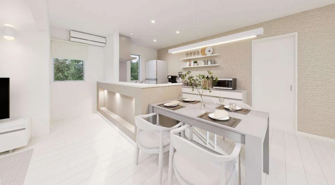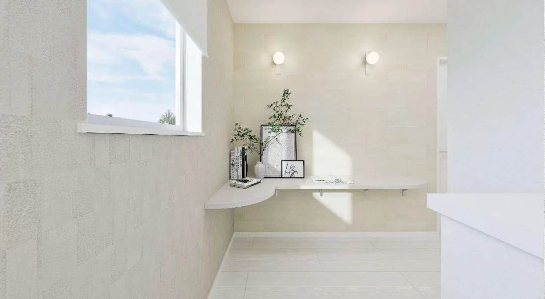 素材違いの白を組み合わせた立体感のある外観デザイン。異なる質感が重なり合うことで、光と影が美しく映え、洗練された印象を与えます。シンプルでありながら奥行きを感じさせる、上質な佇まいです。
