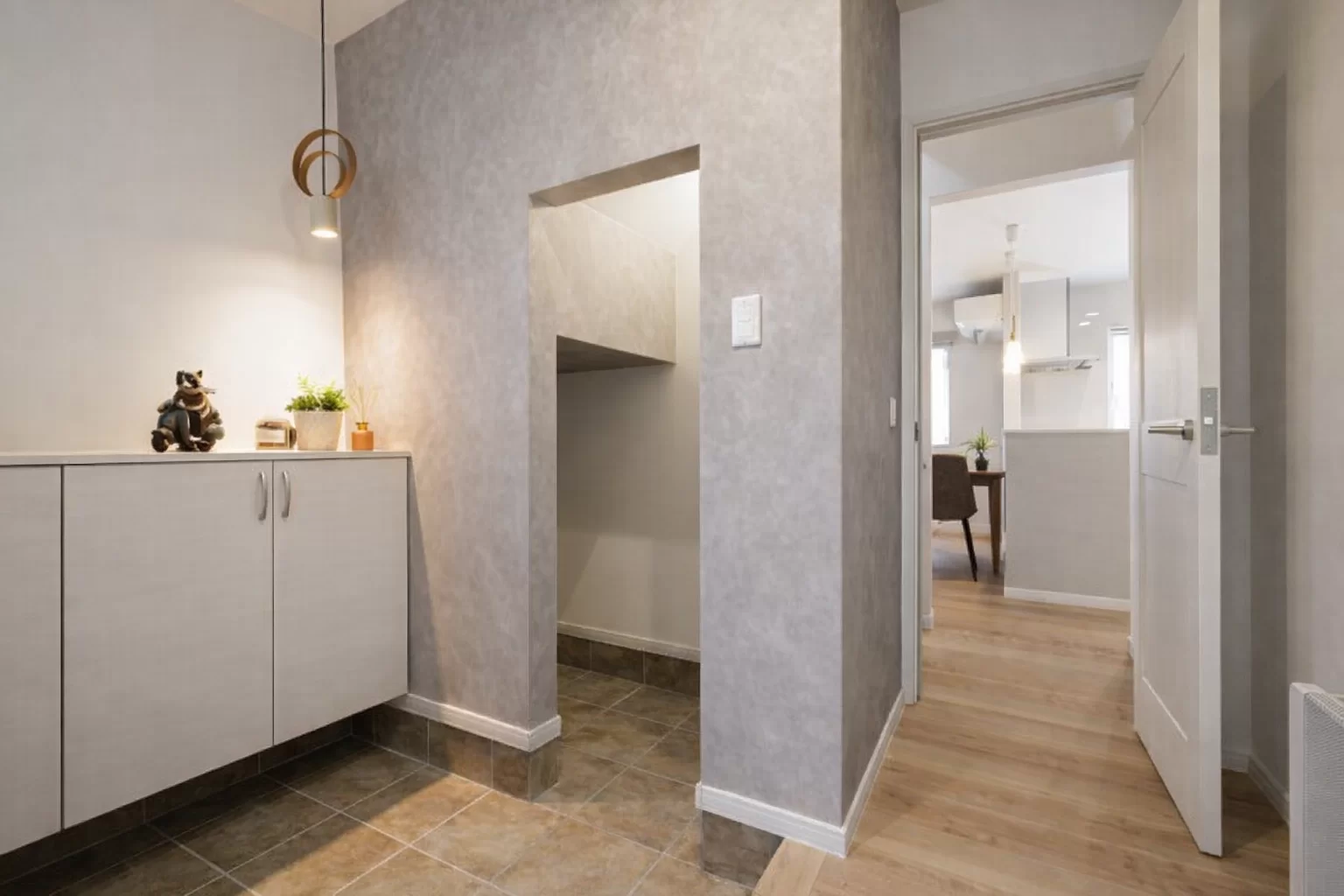 玄関には幅1.2mのローカウンターを設置。靴をさっとしまえるほか、植物やお気に入りの小物を飾ってインテリアも楽しめます。土間収納も備えており、ベビーカーやアウトドア用品など外で使うアイテムもすっきり収まります。