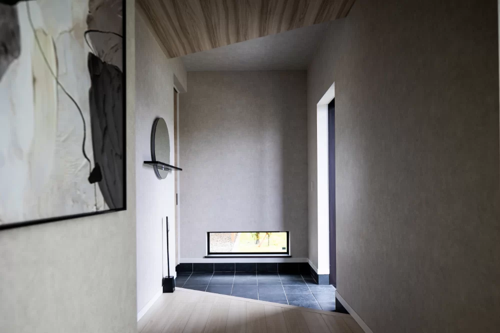 斜めの上がり框と下がり天井がデザインのアクセントの玄関。足元の窓が明るさを添え、ゆとりあるシューズクロークでいつでもすっきりと整う玄関です。
