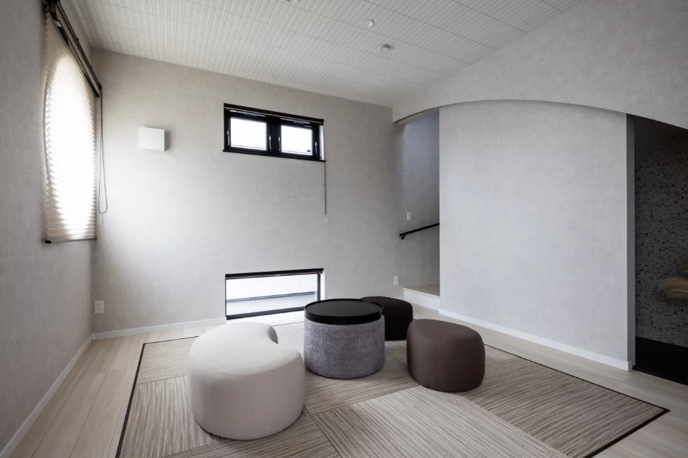 明るい畳が映える上品な和室。円窓や柔らかくアーチを描く垂れ壁が印象的で、現代的で洗練された雰囲気に仕上げています。階段下には床の間スペースがあり、物の整理や季節の花を飾るなど実用性も兼ね備えています。
