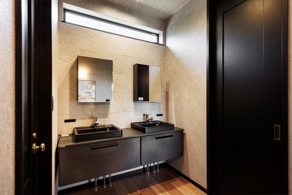 パウダールームには2つの洗面を配置。ブラックのスタイリッシュなデザインで、朝の身支度もスムーズです。