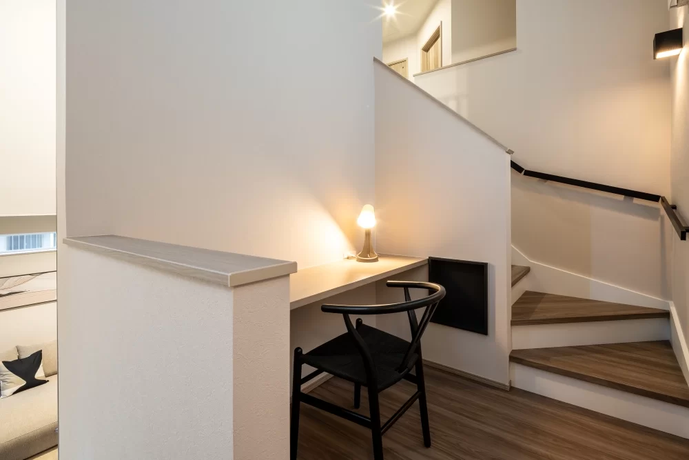 階段の途中にあるスキップフロアは、壁に囲まれたプライベート感のある空間。勉強や在宅ワークにもぴったりな、家の中の“小さな隠れ家”のような場所です。