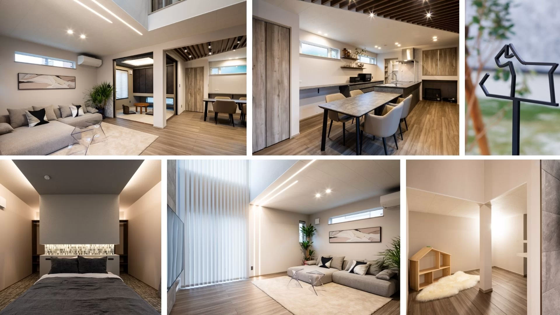 グレータイルのアクセントウォールが主役のリビングと、木目のルーバー天井が印象的なキッチンダイニング。吹き抜けから差し込む光が、素材の表情を際立たせます。