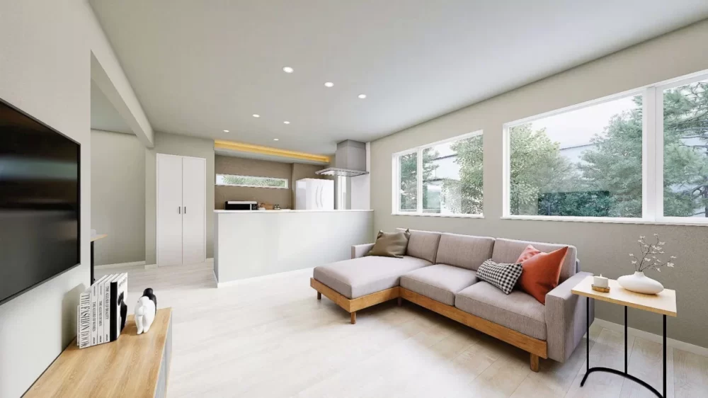 外観はホワイトをベースに、木目とモルタル調をアクセントにしたファサードでナチュラルな柔らかさを演出。高耐久の外壁で、美しさが長く続きます。