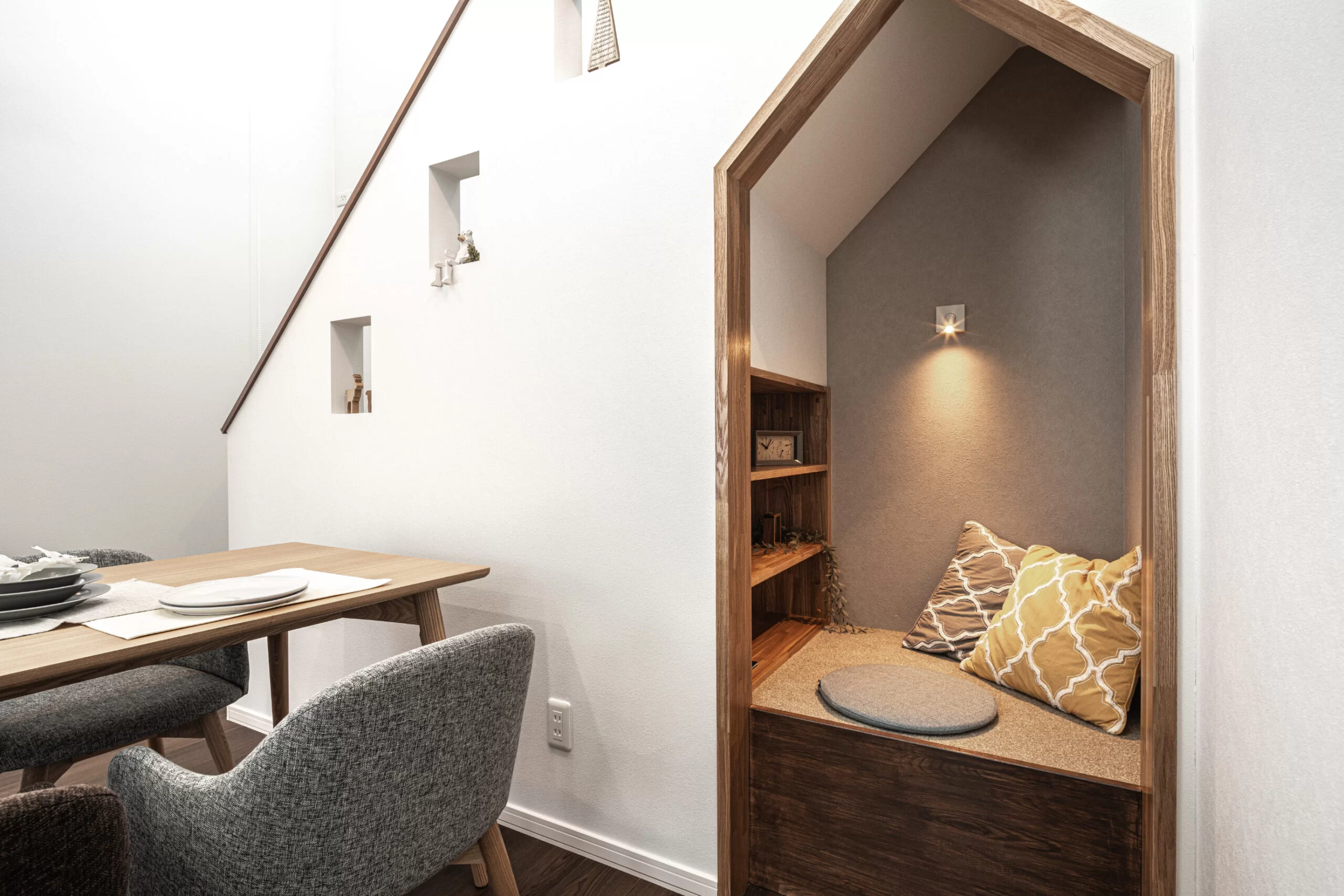 こだわりのヌックには三角の垂れ壁を採用し、さりげないデザインアクセントをプラス。リビングにいながら、読書やゲームなど自分だけの時間をゆったり楽しめる癒しの空間です。