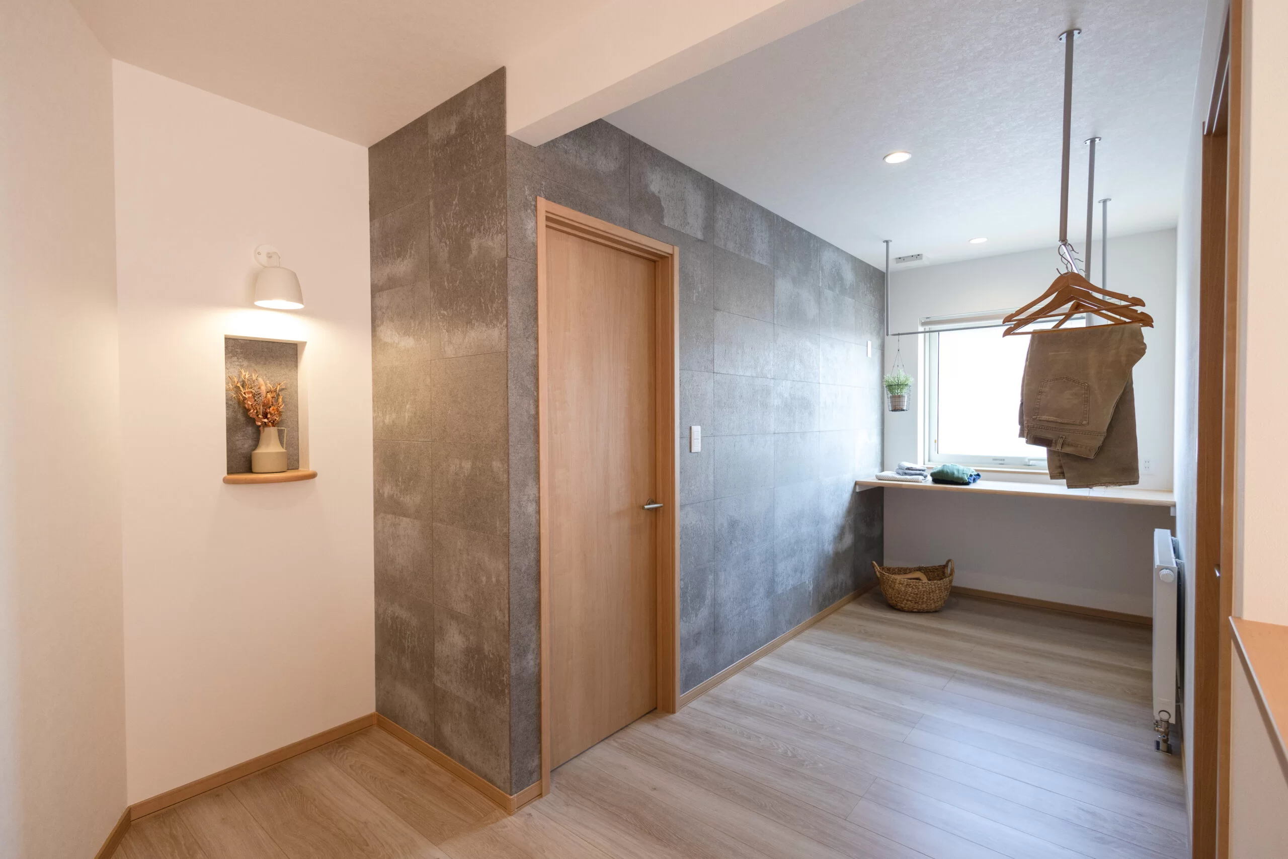 脱衣所には洗濯物干しと、スロップシンクを設置。家事動線を考えた配置で、洗濯や掃除、アイロンがけなど日々の家事がスムーズにこなせます。