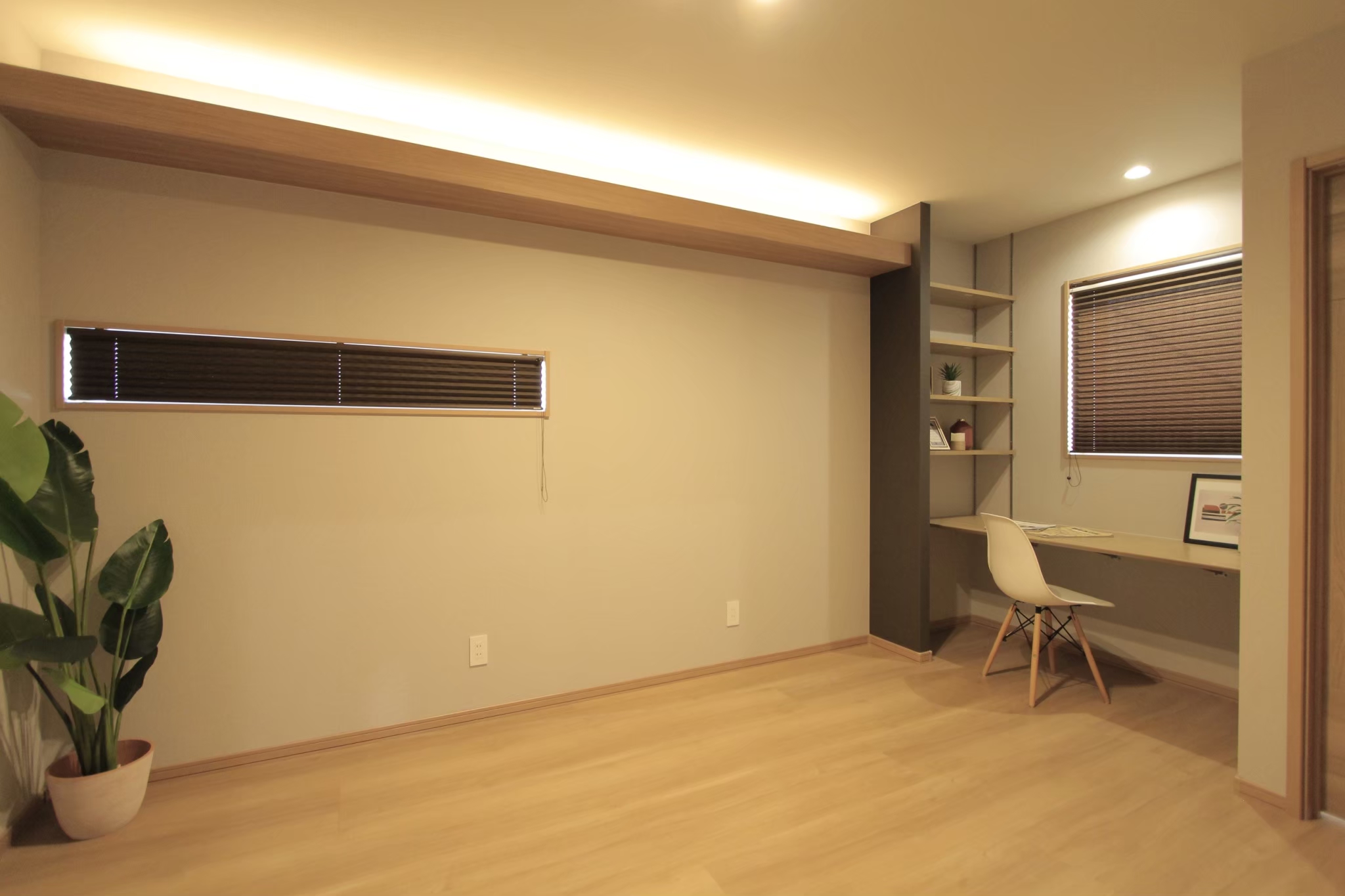 寝室には造作カウンターを設置。読書やスキンケア、趣味の時間など、自分だけのくつろぎスペースに。間接照明が夜の穏やかな時間をやさしく照らします。