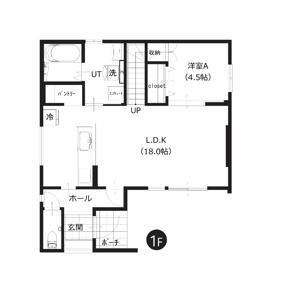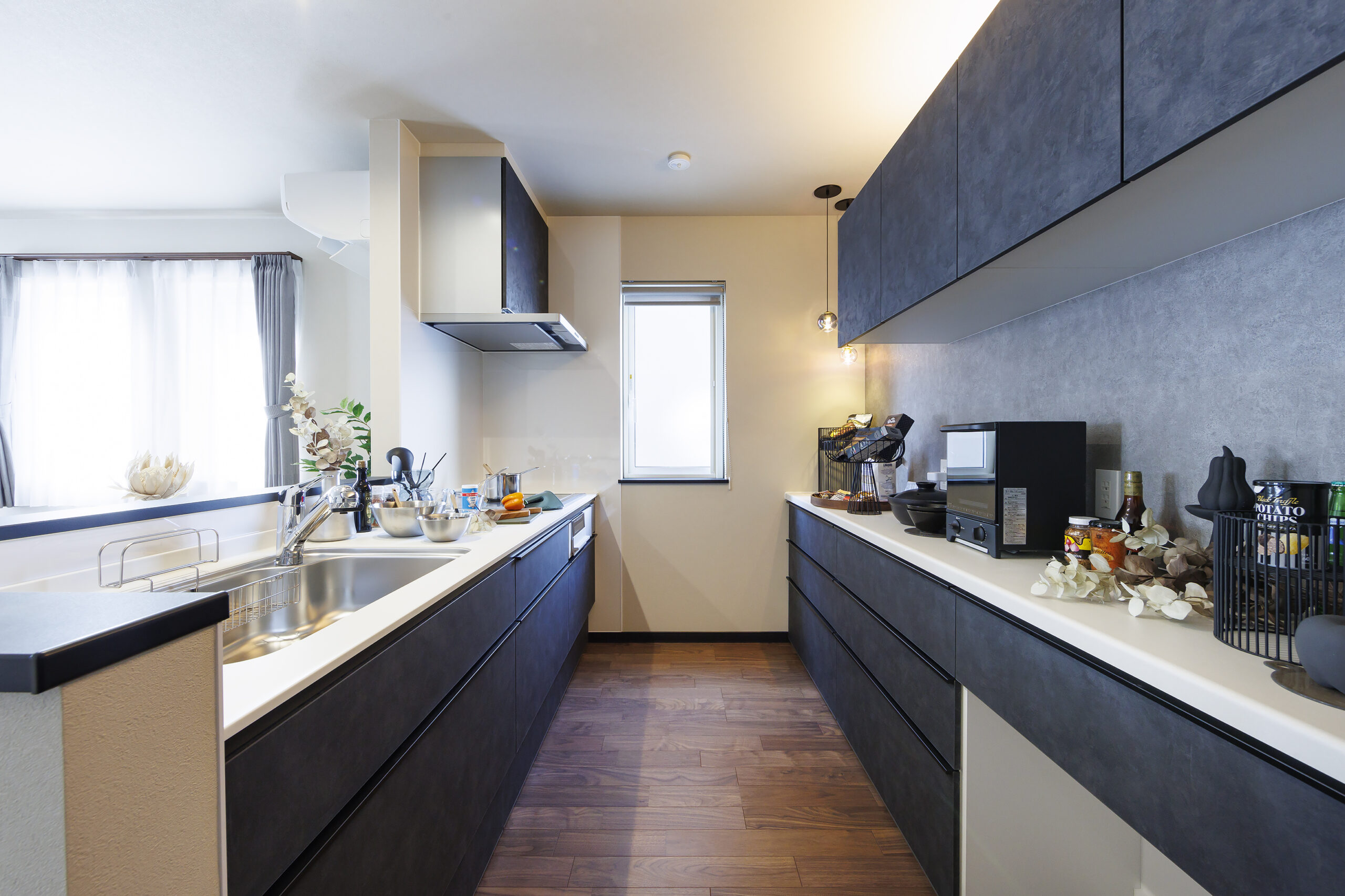 黒を基調としたスタイリッシュなキッチンを採用。腰壁で手元をさりげなく隠しながら作業でき、いつでもすっきりとした印象です。背面には幅2.7mの大容量食器棚を備え、見た目の美しさと使いやすさを両立できます。