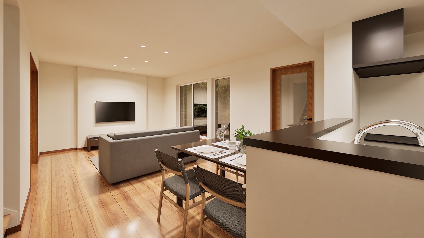 間接照明にやさしく照らされる落ち着きのあるLDK。奥行きのある一直線に広がる空間と壁掛けテレビで開放感たっぷり。玄関からキッチンとリビング両方に出入りできる快適な帰宅動線も魅力です。