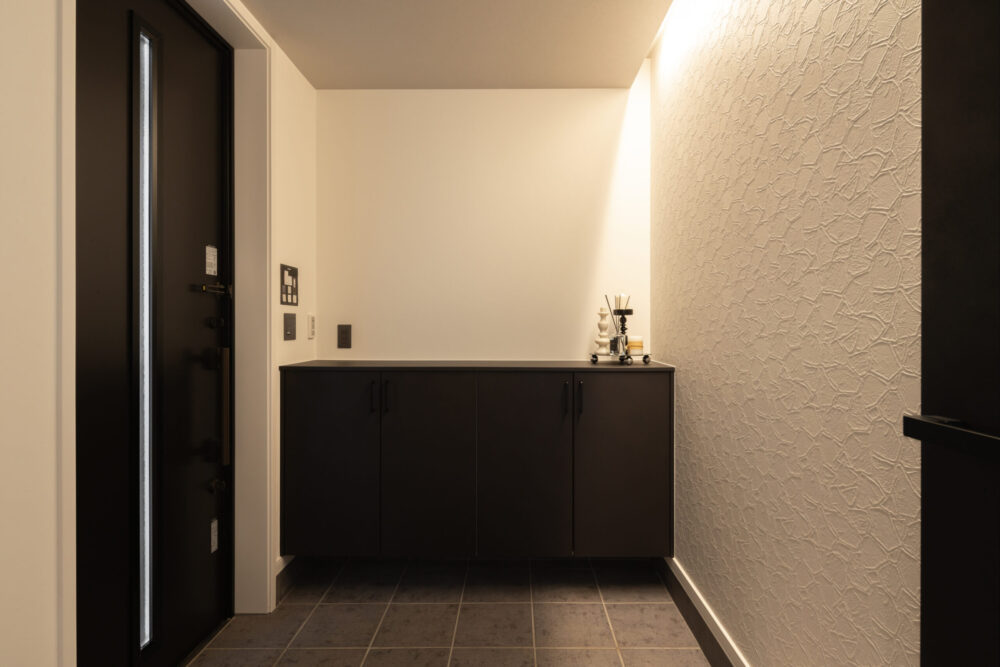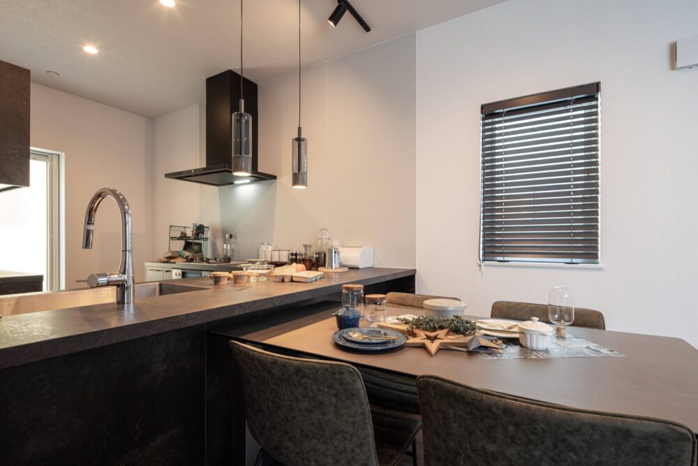 ブラック×グレーで統一された内装に、パナソニックのLクラスキッチンを主役にしたLDK。パントリー付きで生活感を抑え、すっきりとした空間を保てます。