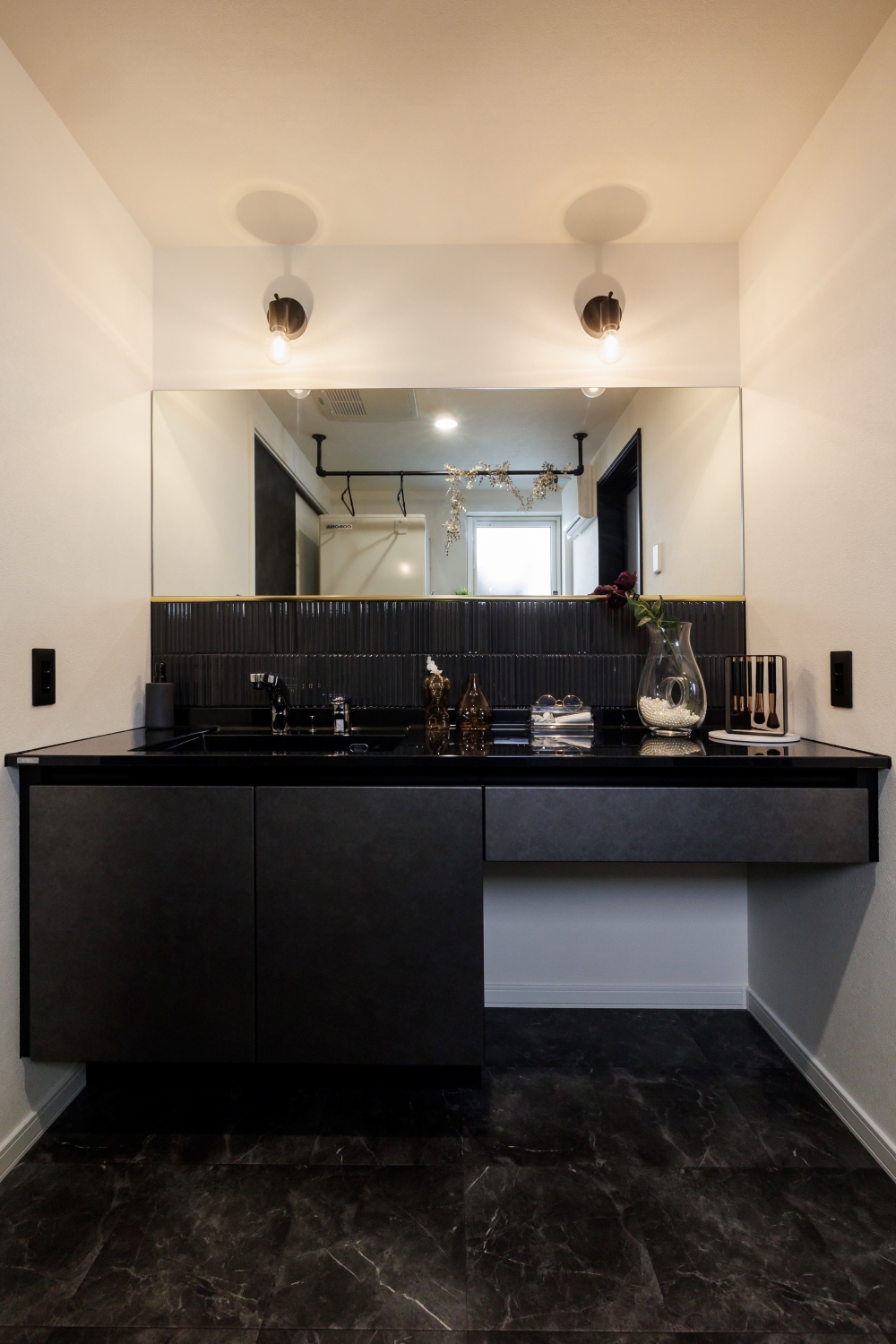 造作風カウンター洗面台は、機能性を保ちつつ生活感を抑え、すっきりとしたホテルライクな空間を演出。脱衣所と独立しているため、家族が入浴中でも気兼ねなく手洗いや身支度ができます。