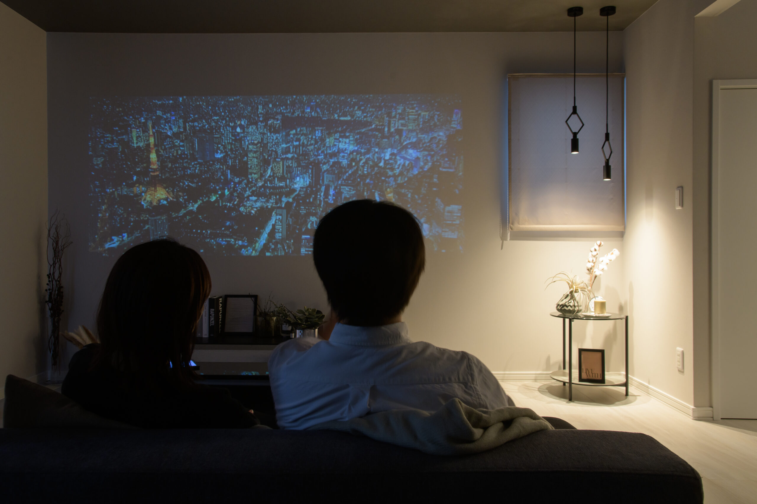 1階に主寝室とウォークインクローゼットを設け、将来的に1階だけで生活が完結。また、プロジェクター用クロスを採用し、映画を大画面で楽しめるくつろぎ空間に。