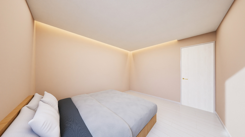 間接照明が灯る寝室は、やわらかな光に包まれる上質空間。まるで非日常のひとときを味わうかのように、落ち着きと特別感を両立させた贅沢な時間を演出します。