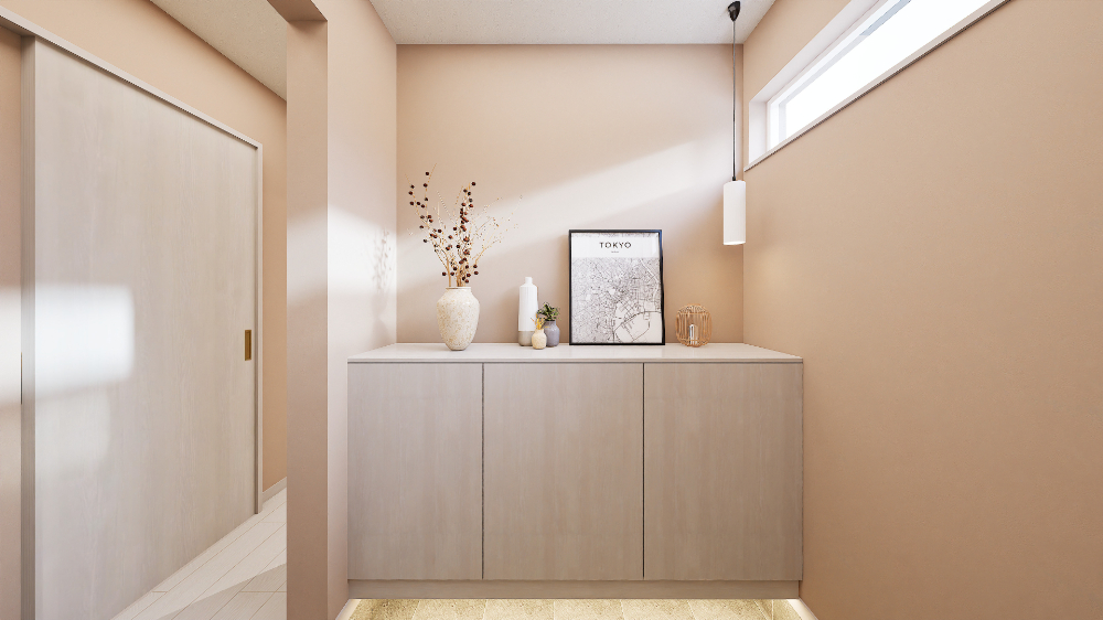 玄関収納の上にはタイル、下には間接照明を設置。光と素材のコントラストでお迎えの空間が華やかになり、毎日の出入りを特別な時間に演出します。