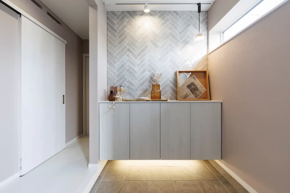 玄関収納の上にはタイル、下には間接照明を設置。光と素材のコントラストでお迎えの空間が華やかになり、毎日の出入りを特別な時間に演出します。