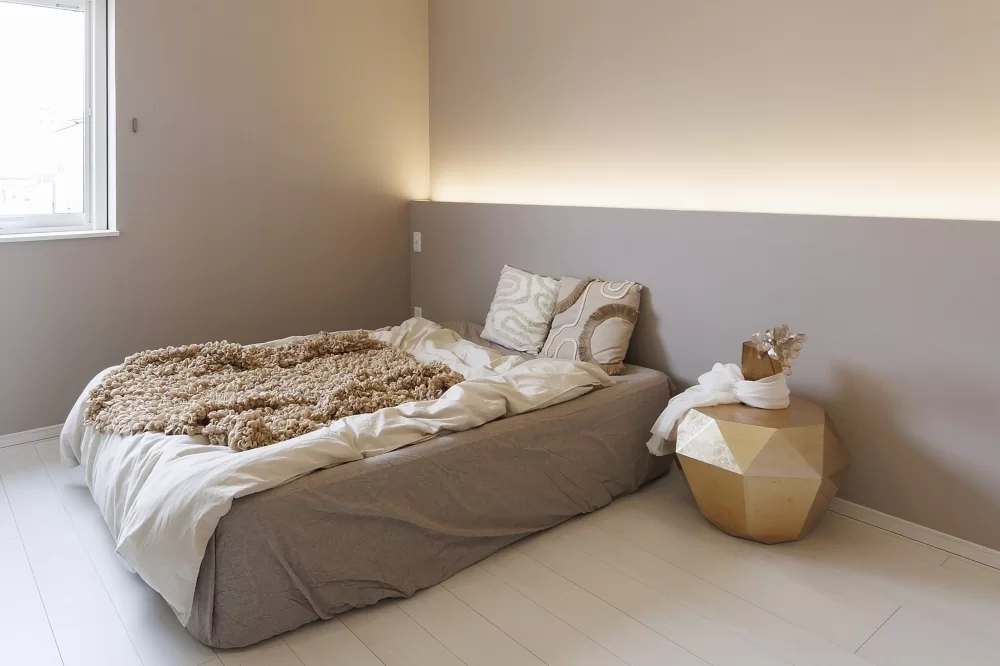 間接照明が灯る寝室は、やわらかな光に包まれる上質空間。まるで非日常のひとときを味わうかのように、落ち着きと特別感を両立させた贅沢な時間を演出します。
