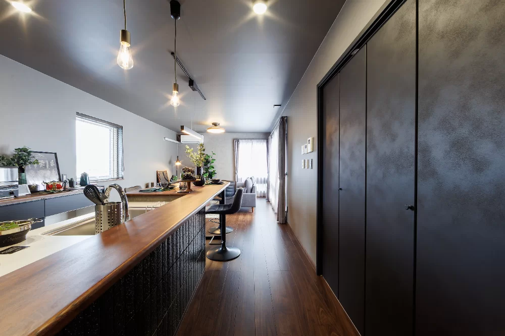 ブラックを基調にウッドのアクセントで温もりを添えた上質なリビング。床暖房で暖房器具が不要なすっきりとした印象に。デザイン性と快適さを兼ね備えた心地よい暮らしの空間です。
