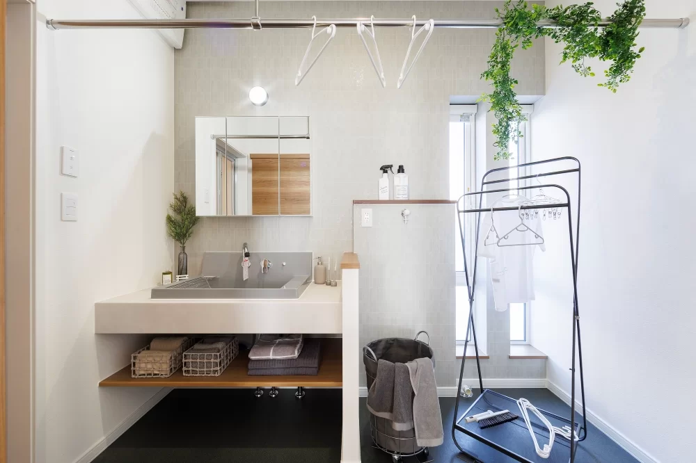 洗面台は造作風のカウンタータイプを採用し、スタイリッシュで使いやすいデザインに。下部がオープン棚でタオルなども整理でき、見た目もすっきりした快適な空間となっています。