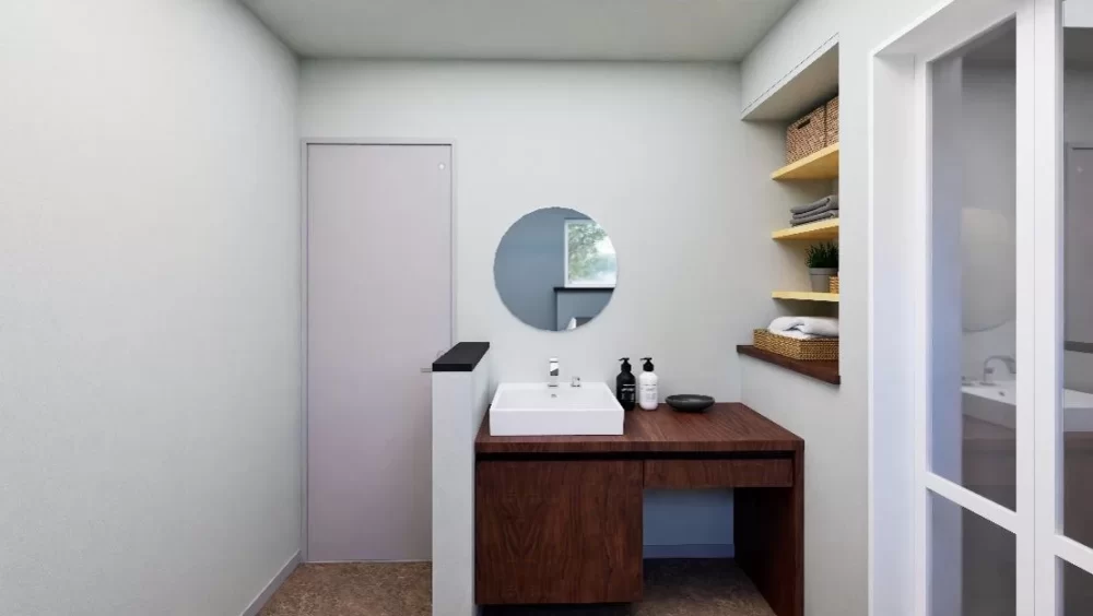 カウンタータイプの洗面化粧台は、椅子を置けばドレッサーとしても活躍。豊富な収納棚が空間をすっきりと保ち、忙しい朝も心地よく過ごせます。