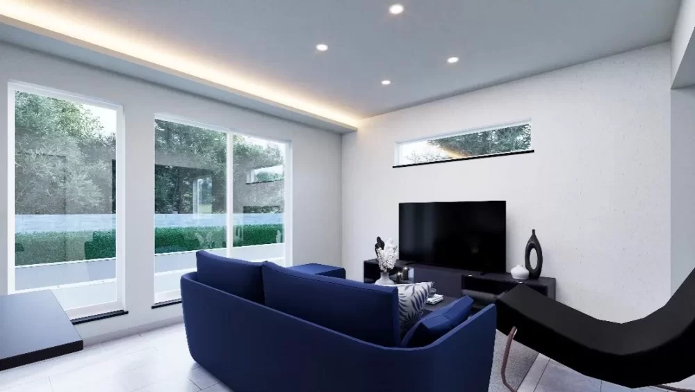 天井に配した間接照明が、空間をやさしく包み込むLDK。ストレートな広がりを感じられる設計で、家族が自然と集まる場所に。