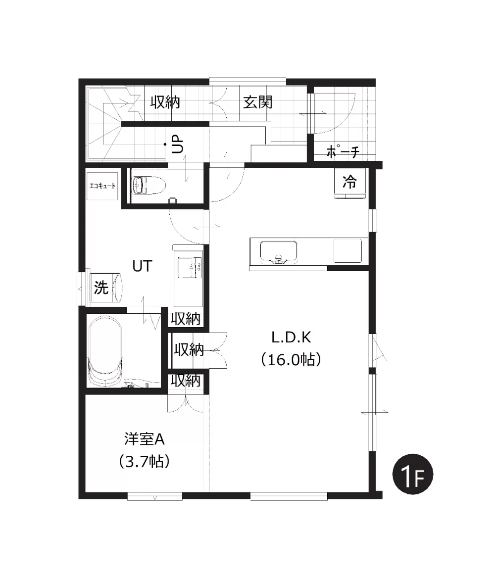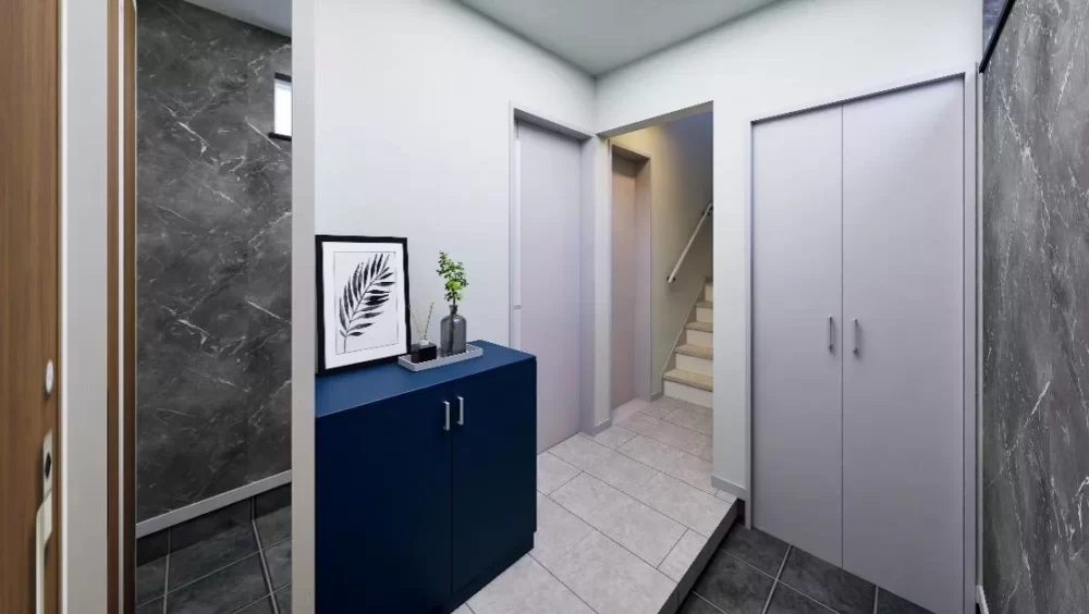 L字型のシューズスペースは、複数人でも並んで使える広さと動線を確保。ローカウンター収納とシューズクロークを備え、玄関をいつでもすっきり保てます。