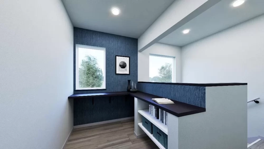 ブルーのアクセントクロスが映える2階ホールには、収納付きカウンターを設置。リモートワークや趣味、読書など、ライフスタイルに合わせて自由に活用できます。