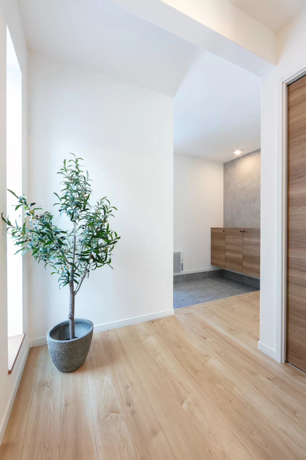 玄関ホールを斜めに切り取り、リビングへと続く動線を演出。視線が奥へと自然に抜け、空間に奥行きを生み出します。フローリングには無垢材のような風合いを持つ天然木突き板を採用。やさしい木目が住まいにあたたかみを添えます。