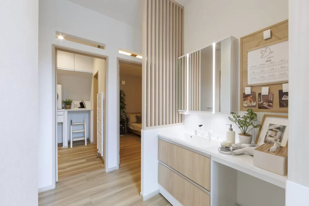 スリット格子で緩やかに仕切られた洗面スペース。タイル貼りの造作風化粧台が空間をおしゃれに演出します。洗面とユーティリティを分けて配置することで、来客時も気兼ねなく使える設計です。