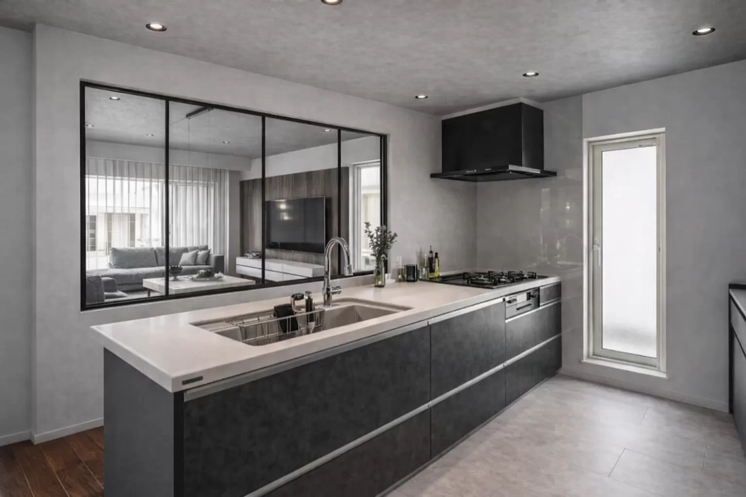 愛猫との暮らしを大切にした、リビングとゾーニングしたキッチン。室内窓からリビングを見渡せ、家族の気配を感じながら過ごせます。広々としたパントリー付きで、いつでもすっきり整います。
