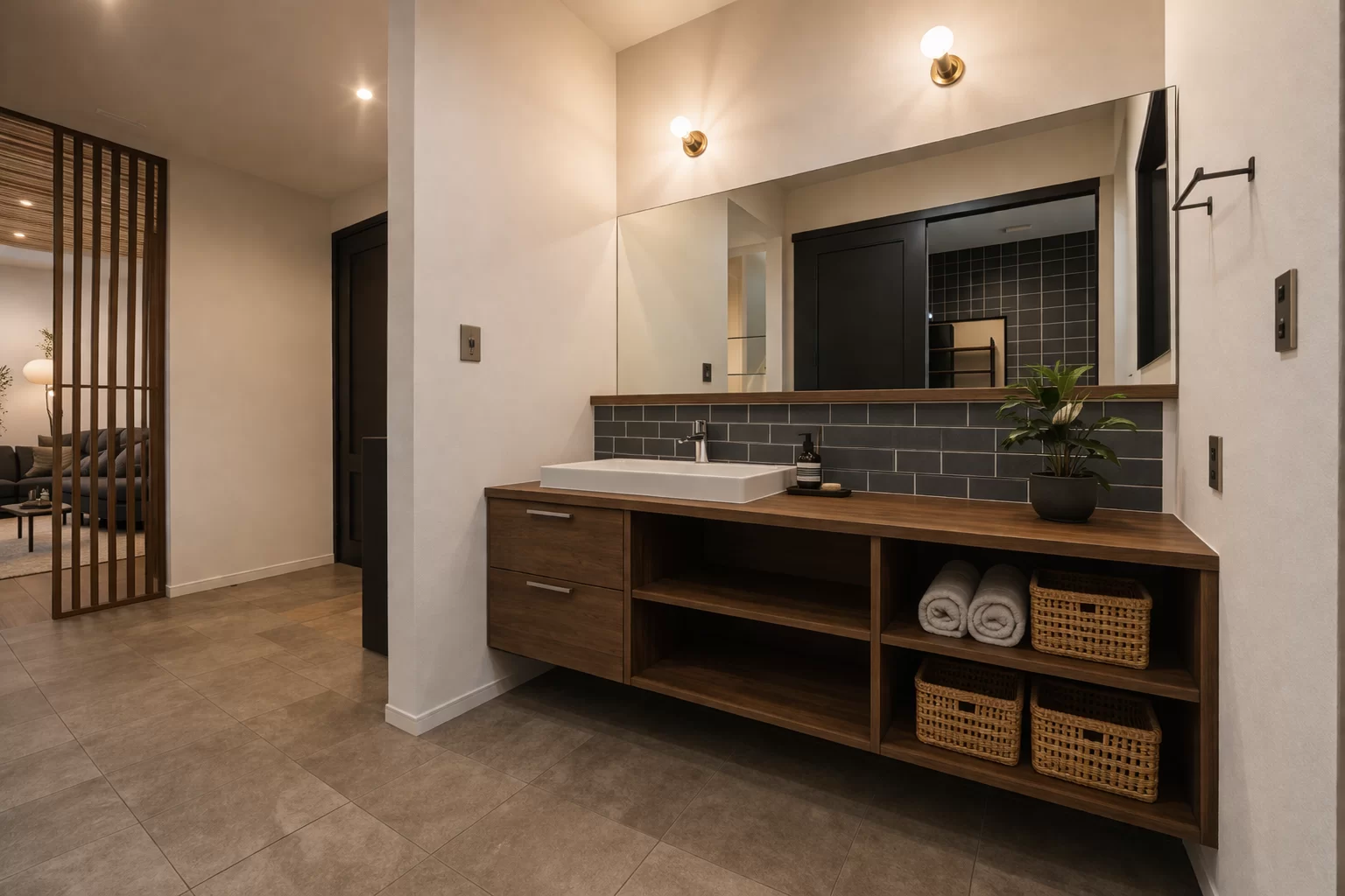 木のぬくもりを感じる造作風の洗面化粧台。タイルや木目調のオープンキャビネットを組み合わせ、デザイン性と使い勝手を兼ね備えた、こだわりの空間に仕上げました。