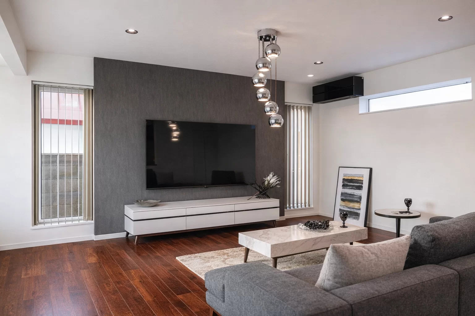 家全体をぐるっと回れる回遊動線により、暮らしやすさと快適性を高めた住まいです。また、テレビ背面にはふかし壁を採用し配線を隠すことで、空間に統一感をもたらしています。